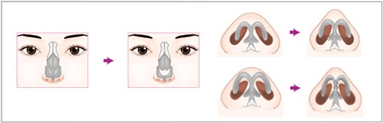 肥厚鼻尖矫正术:人们俗称这类鼻子为“蒜头鼻子”,治疗这类鼻尖的手术采取缘切口或软骨间切口。切除鼻翼软骨头侧的l/2—2/3,向内侧和头侧旋转外侧脚,此时可见鼻翼内收。在鼻翼软骨穹窿部间断划开软骨,不可切断。加固鼻孔或横鼻孔还不能变成纵向,则在鼻翼基部做楔形切除;如鼻尖欠高,可将切下的软骨垫在穹窿表面,以抬高鼻尖。