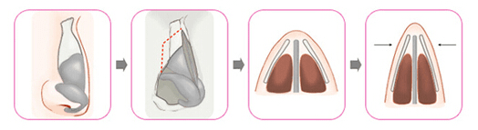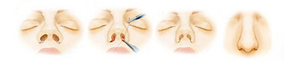 1、切除过长的鼻翼软骨:经鼻孔缘切口,切除过长的两侧鼻软骨下端或鼻翼软骨外侧角上段及外侧部。此法亦适用于鼻尖缩小整形。