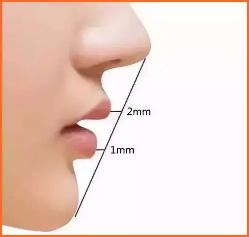 侧面鼻头与下巴连成线时,上嘴唇相差2毫米,下嘴唇相差1毫米。