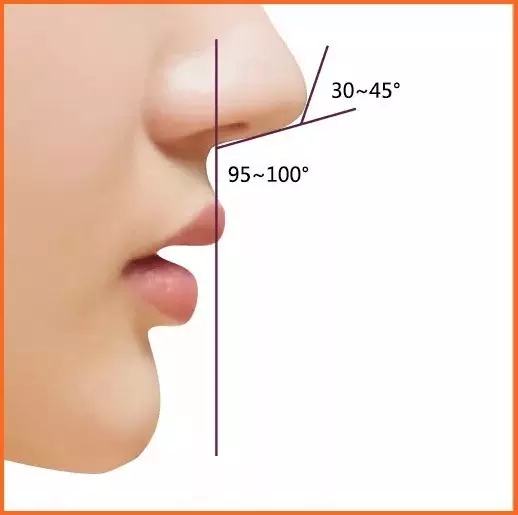 理想的侧面鼻小柱与人中呈95~100度,鼻头与鼻小柱呈30~45度。
