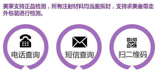 美莱只选择通过中国食品药品监督管理局(SFDA)严格认证的注射美容产品;近乎苛刻的药品监管机制,严格管理针剂的来源渠道、操作规范、保存条件,符合标准。