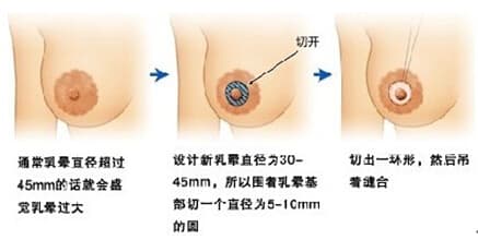 以乳头为,以适当半径画圈(一般为1。5-2。5cm),为此范围外的环行乳晕皮肤切除,应保留皮肤层及皮下血管网,以防乳头乳晕供血不足。外圈皮肤在横径方向的内外各切除一块三角形皮肤以缩小半径,使其与新乳晕的半径一致。较后,外圈皮下稍加游离后对位缝合。