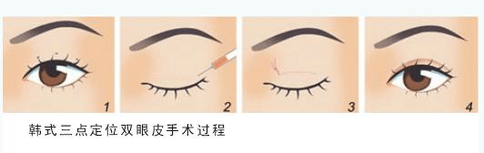 韩式三点法:在上眼睑皮肤的合适位置,轻柔地制作三个长度仅有2—3毫米的不连续的微小伤口,去掉部分脂肪和多余皮肤,并将皮肤层与眼睑进行三点缝合。做出的双眼皮线条自然美观,睑缘充分舒展,睫毛自然上翘,且创口更小,消肿更快,可维持。
