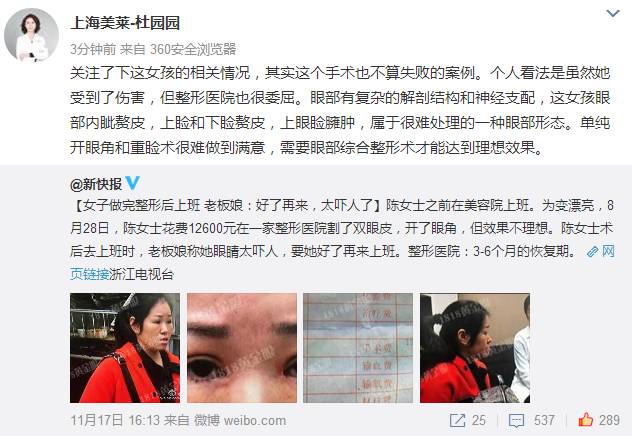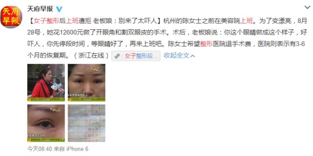 小编今早一翻微博,不翻还好,一翻吓一跳,上海女子做了个双眼皮和开眼角,老板娘竟然说:吓死人了,让她好了再来上班!