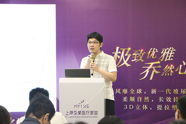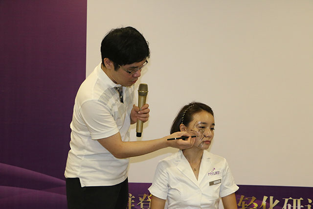 张耀元医生从当下热门的微整形项目说到微整形的技术手法,说到精彩处,还现场征集了一位美女同事,为我们解读注射前设计的每一步分解讲授设计理由。
