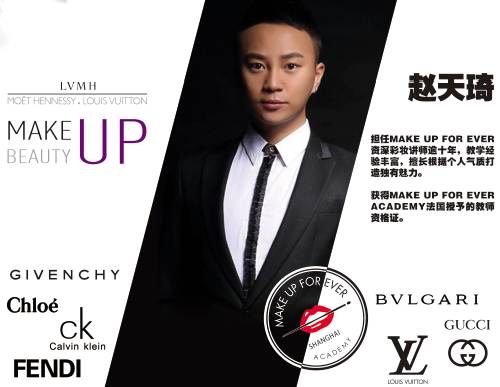 赵天琦先生担任MAKE UP FOR EVER彩妆讲师逾十年,教学经验丰富,擅长根据个人气质打造独有魅力,获得MAKE UP FOR EVER ACADEMY法国授予的教师资格证。