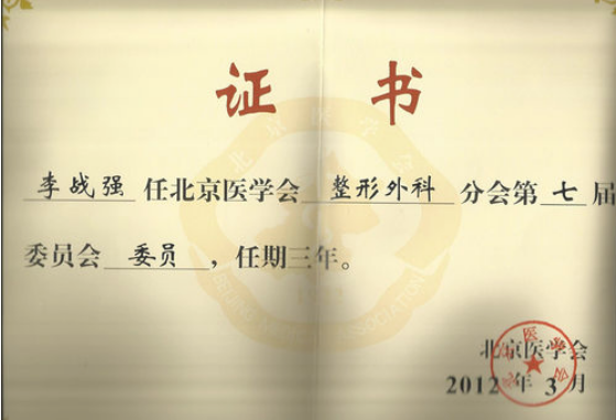 2012年3月当选为北京医学会整形外科分会第七届委员