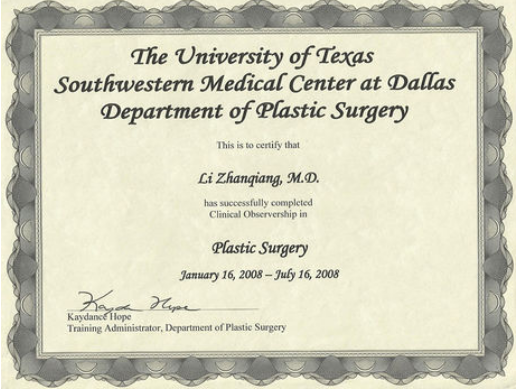 全球鼻整形圣地达拉斯市得克萨斯大学西南医学进修证明